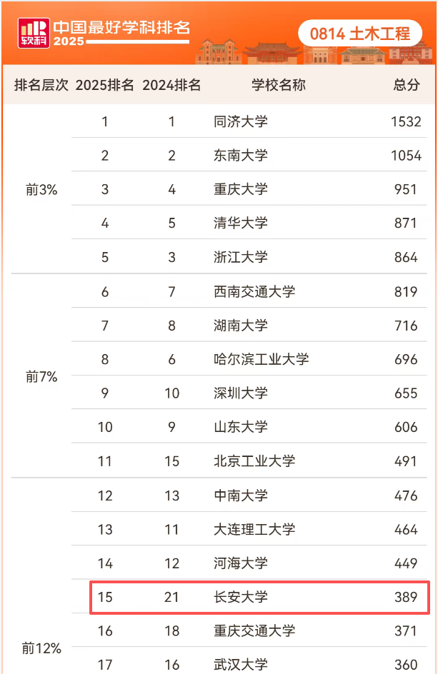 10月15日,著名高等教育评价机构——上海软科正式发布“2025软科中国最好学科排名”,全国共有167所设点高校参与土木工程学科排名,本次公布排名前50%高校(共计83所)。2025年,由做爱A片 牵头建设的土木工程学科位列第15位,由2024年的第21位上升至第15位,稳居全国前12%。